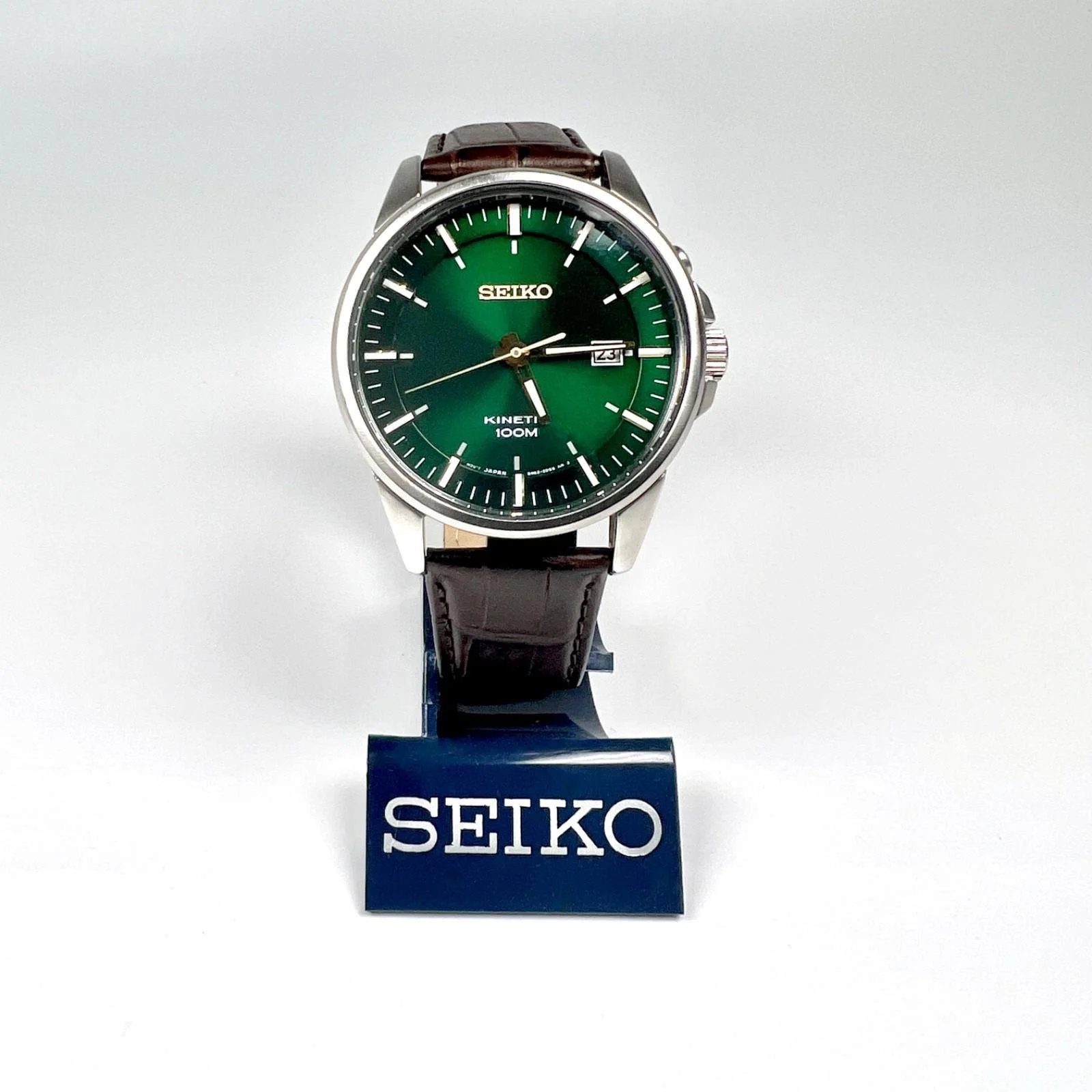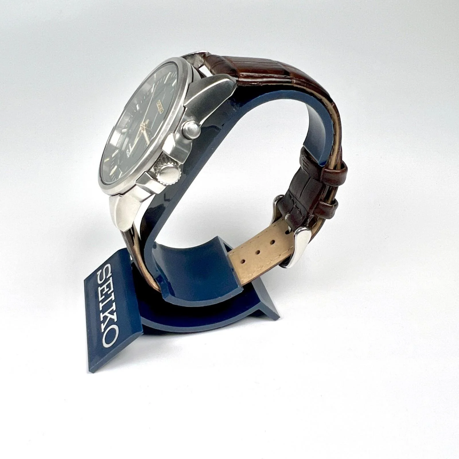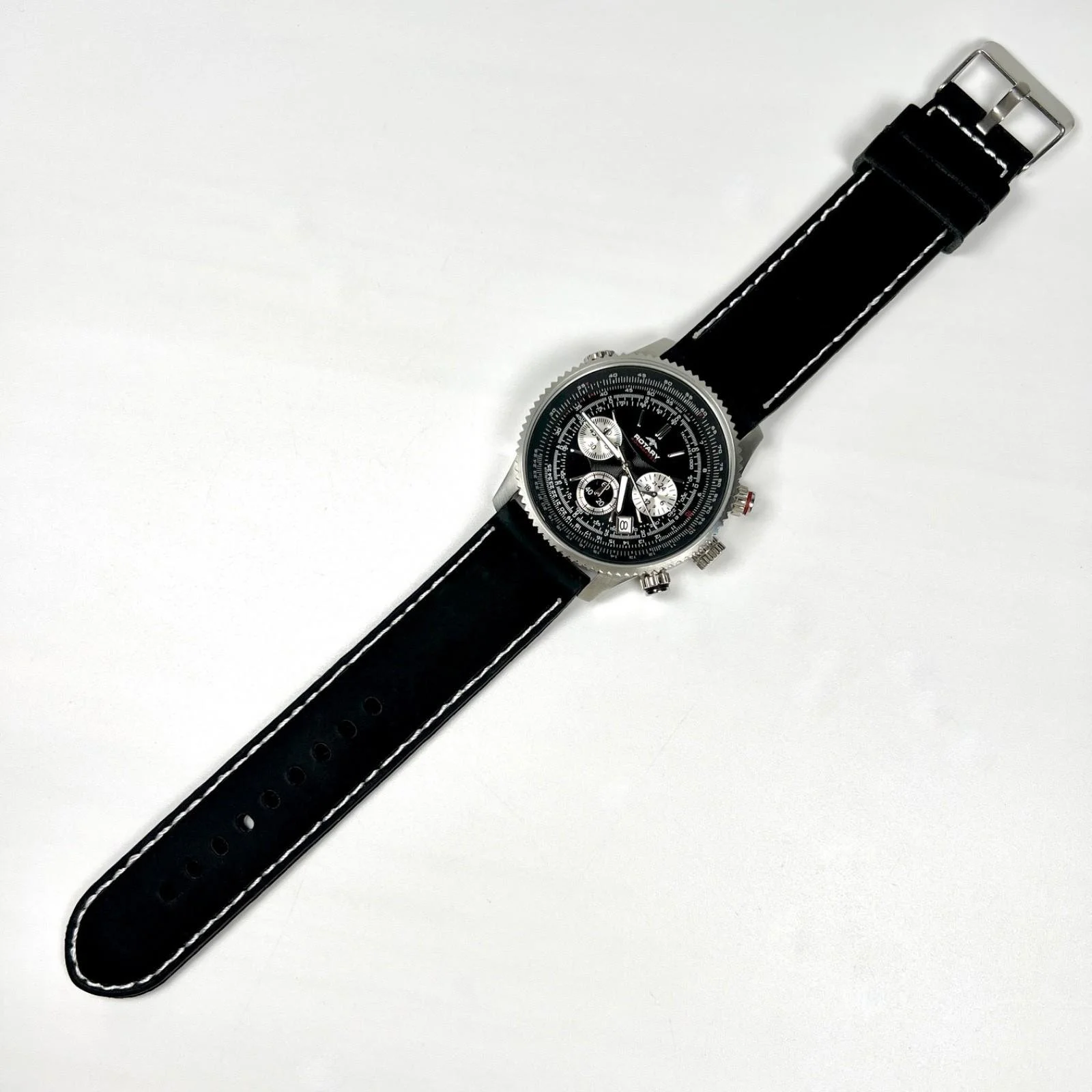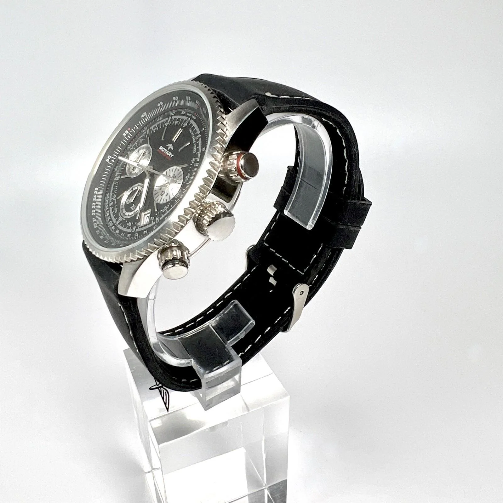 Black dial with luminescent silver hands with luminescent baton/numeric hour indexes and inner minute ring