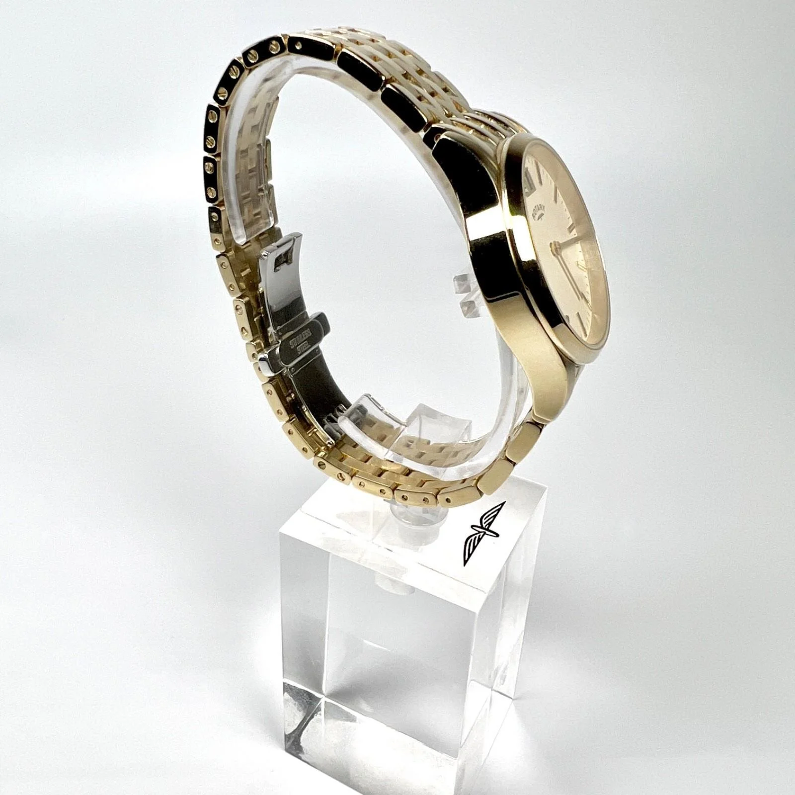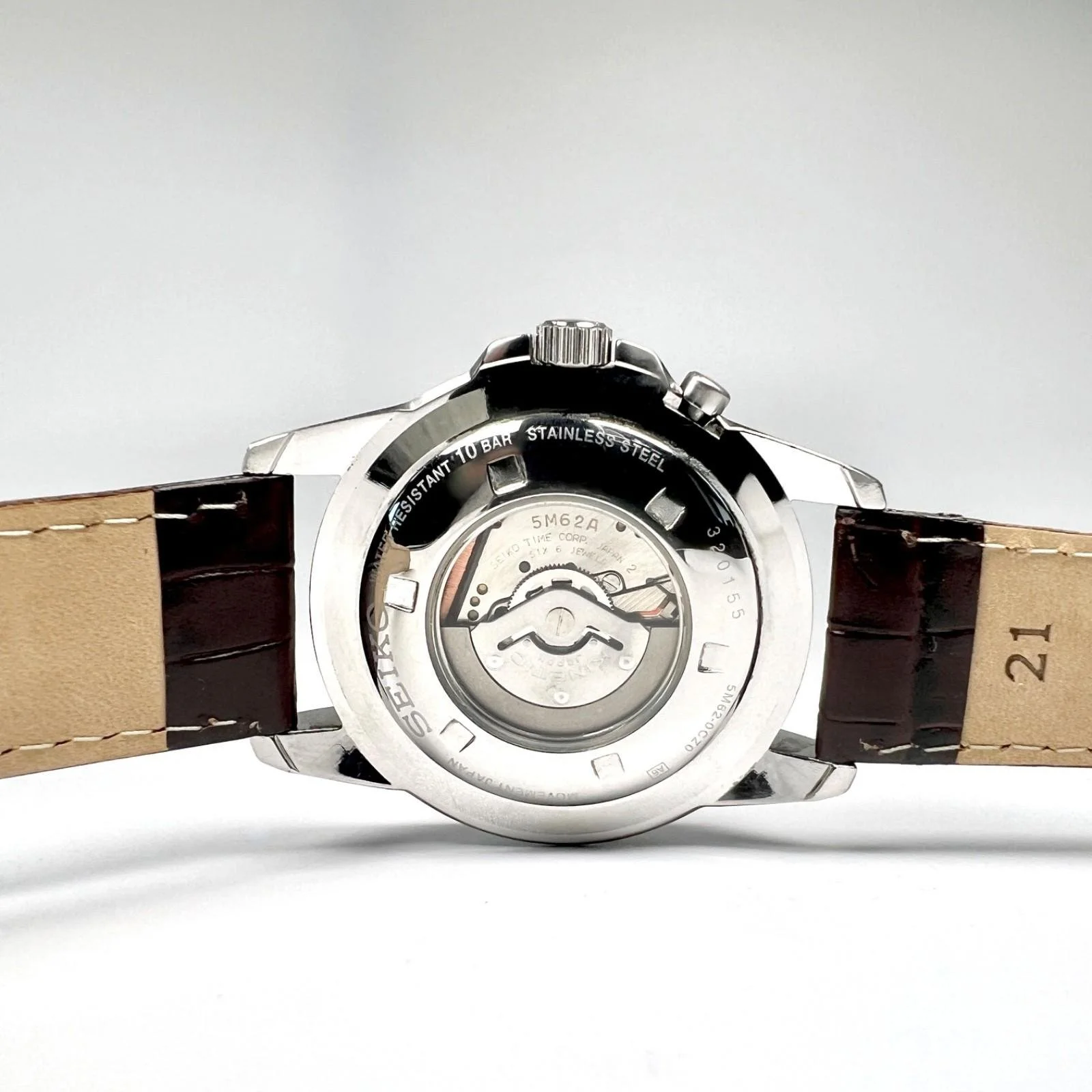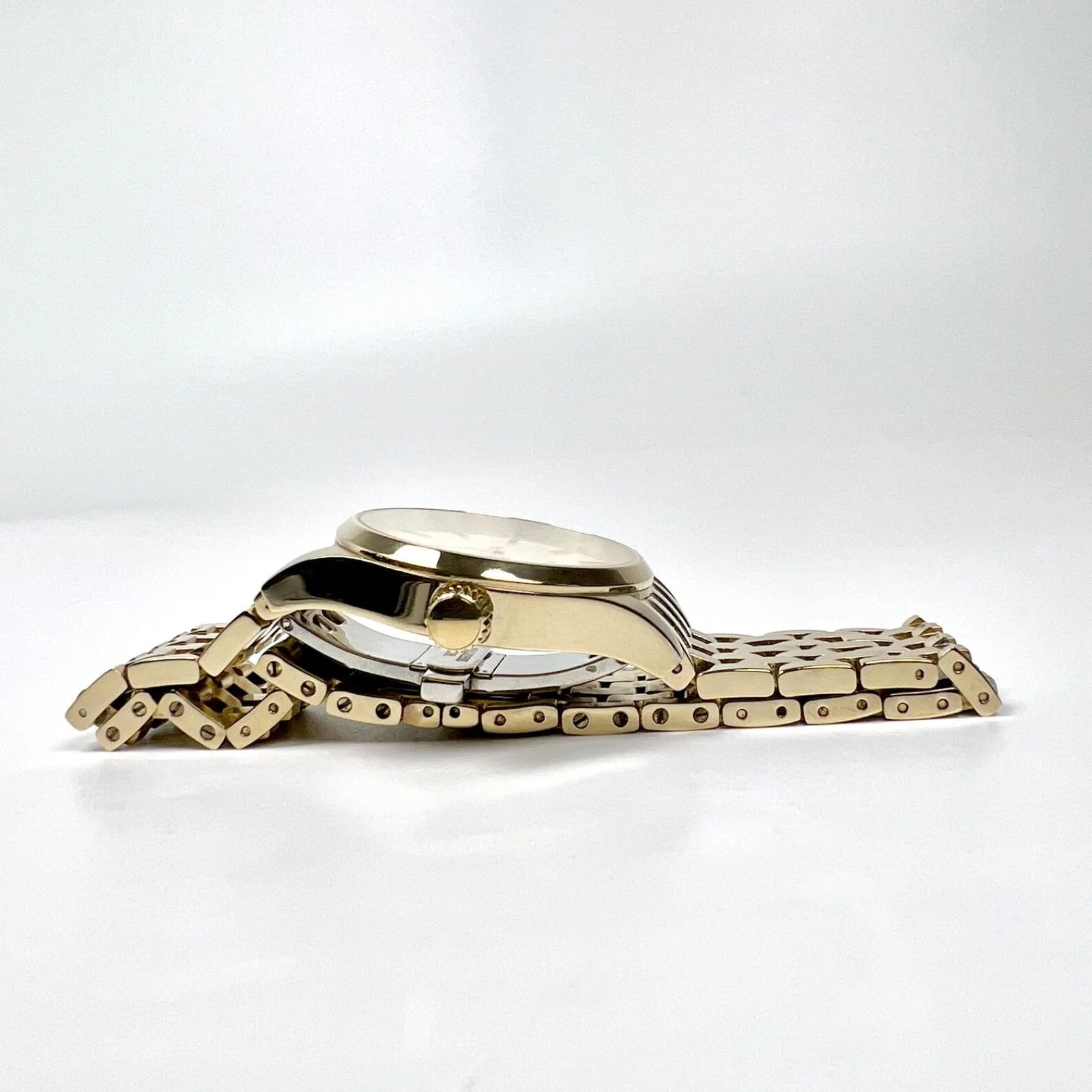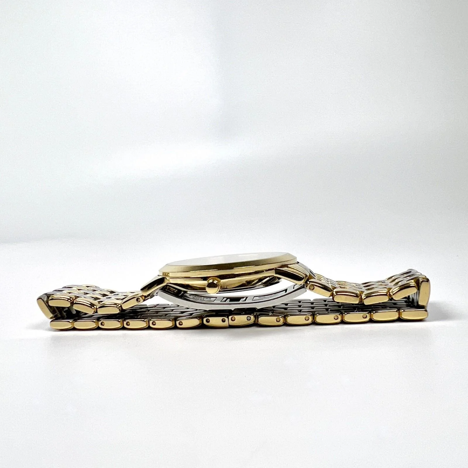 Stainless steel case with polished sides, brushed bezel & lugs and ridged-edge crown