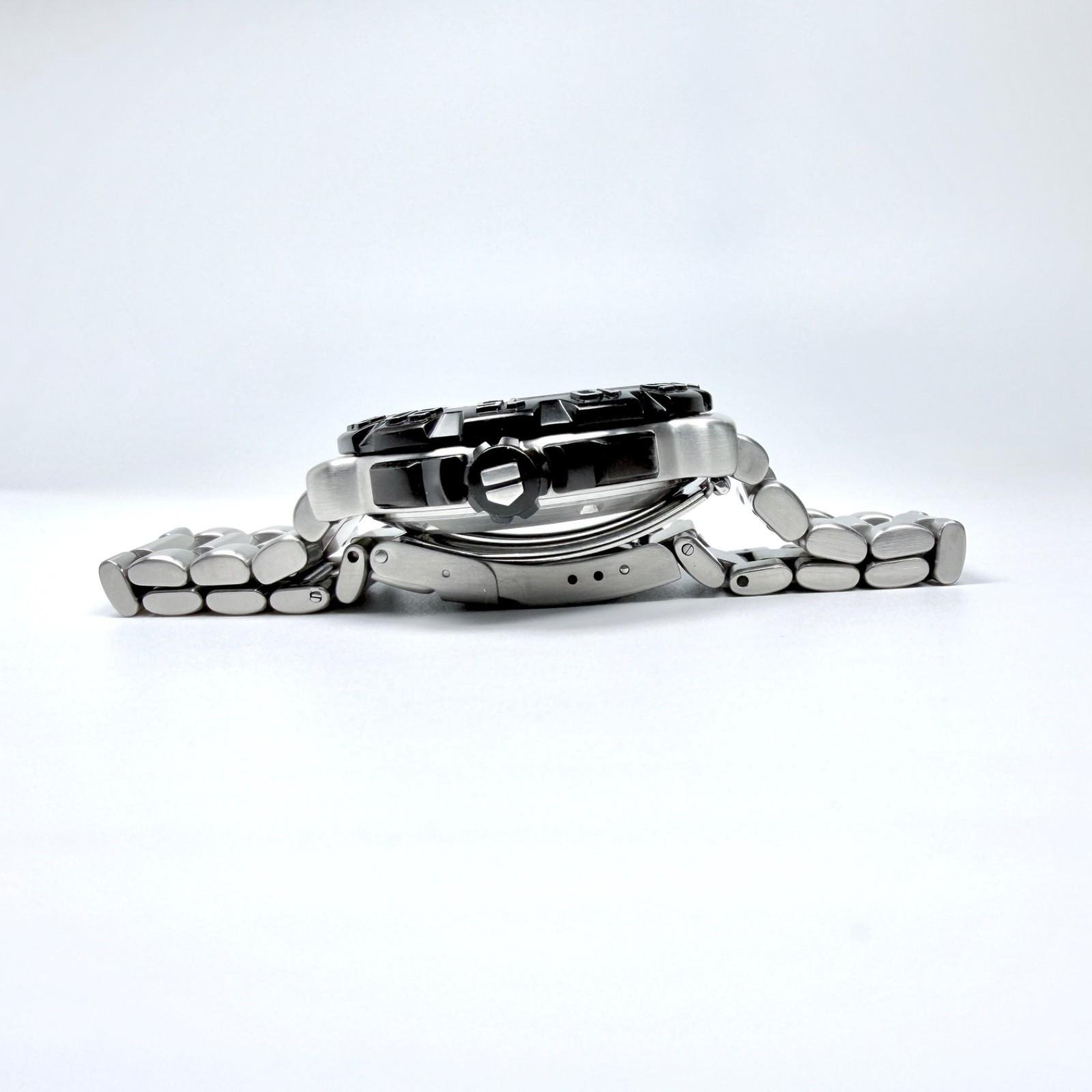 Stainless steel case with brushed sides, brushed lugs and uni-directional divers bezel with polished bezel guards, signed ridged-edge screw down protected crown with polished pushers